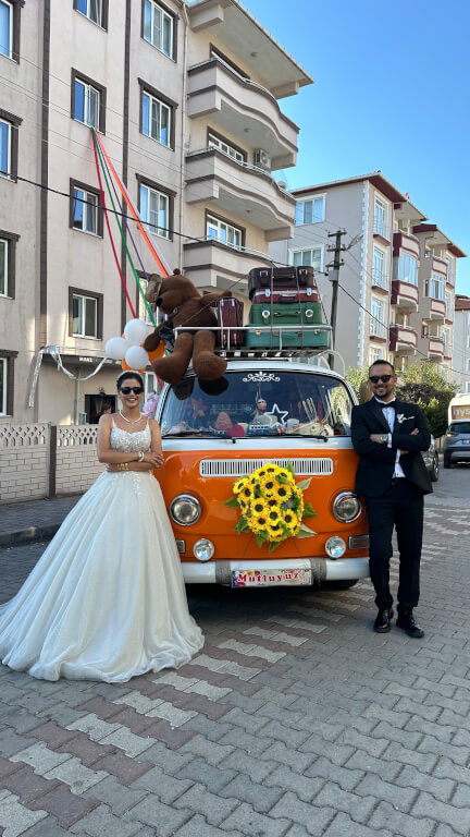 Evlilik gününüzde unutulmaz bir dokunuş yapmak isteyen çiftlere özel olarak tasarlanmış Mecnun, klasik bir VW minibüsün nostaljik ruhunu modern dokunuşlarla buluşturuyor. Canlı turuncu rengi ve zarif süslemeleriyle, düğün gününüzde enerjik ve neşeli bir atmosfer yaratıyor. Tavanındaki sevimli dev ayıcık ve balonlar, bu aracı hayallerinizdeki düğüne yakışacak mükemmel bir yol arkadaşı haline getiriyor. Fotoğraflarınızda harika bir fon olacak Mecnun ile düğün gününüzü hem romantik hem de eğlenceli bir şekilde taçlandırın. Bu eşsiz aracı seçerek, en özel anlarınızı unutulmaz kılın!